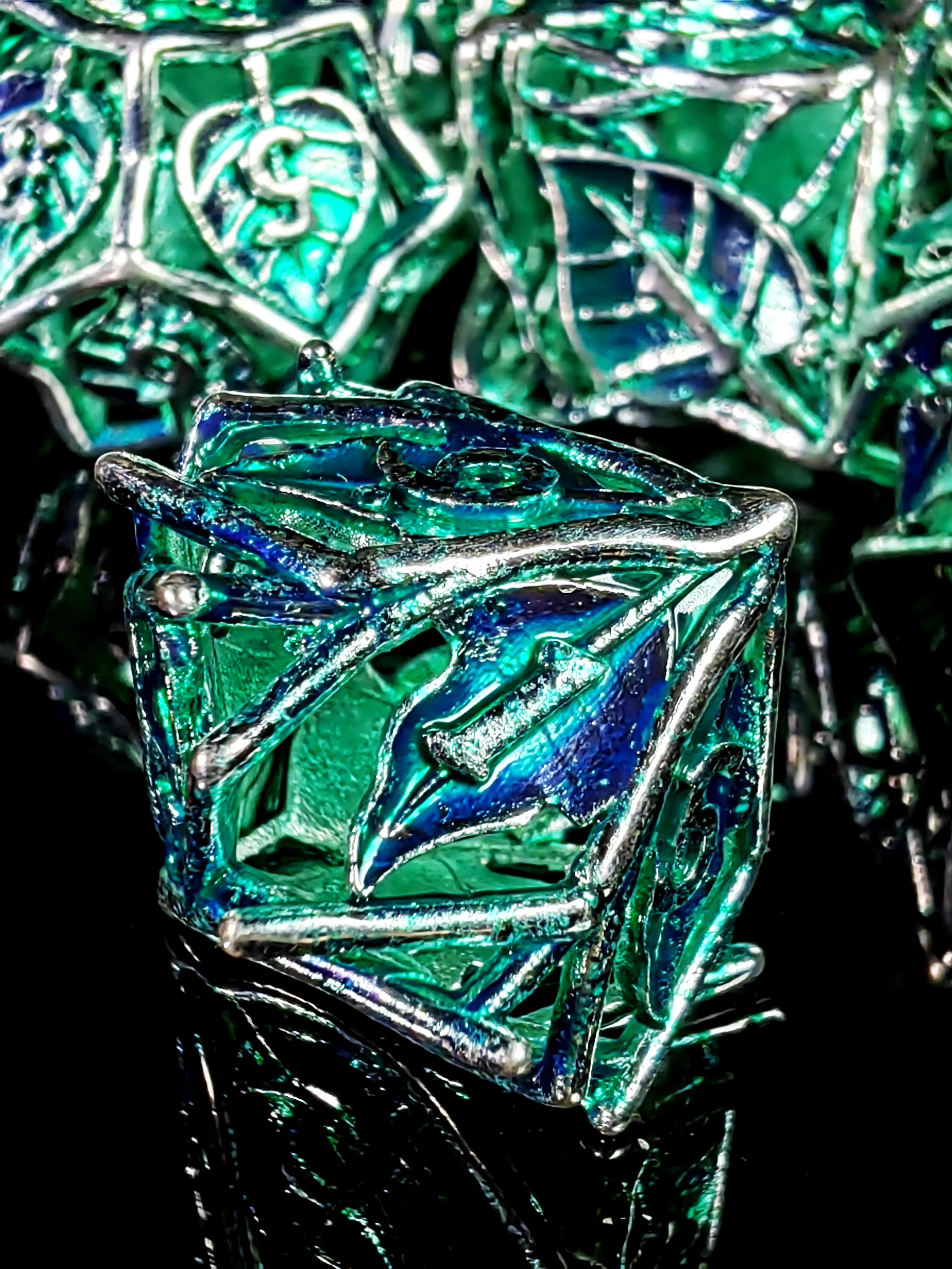 DnD Dice Set - 7 Piece Zinc Alloy Metal Dice with Leaf Pattern, Green Base Silver Numbers for RPG, Dungeons & Dragons
