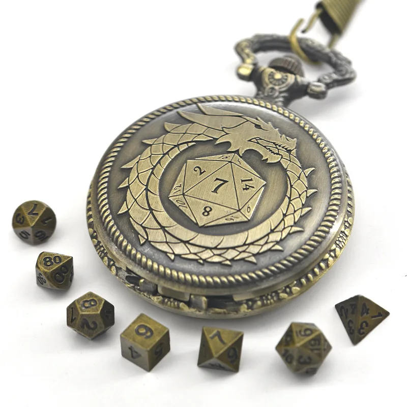 Vintage Dragon Pocket Watch Box Dice Necklace Board Game Accessories, Fashion Jewelry Gifts for Men and Women